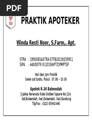 Sipa, alamat dan nomor telepon apotek. Apoteker yang menyelenggarakan praktik kefarmasian di apotek wajib memasang papan nama praktik. Surat keputusan pengurus pusat ikatan apoteker indonesia nomor : Pengurus pusat ikatan apoteker indonesia. 005/ pp.iai/1418/vii/2014 tentang peraturan organisasi tentang papan .